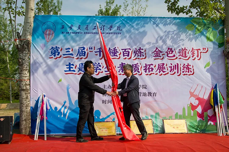 最后,由院长崔炳谋授旗,并宣布“千锤百炼金色道钉”主题学生素质拓展训练活动正式开始!