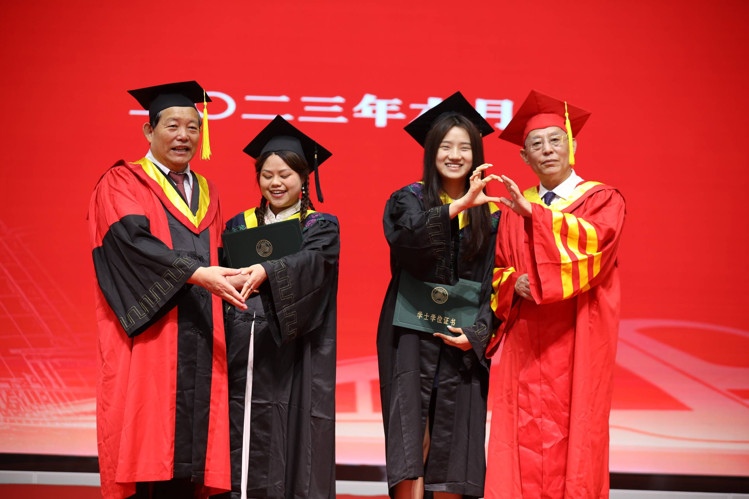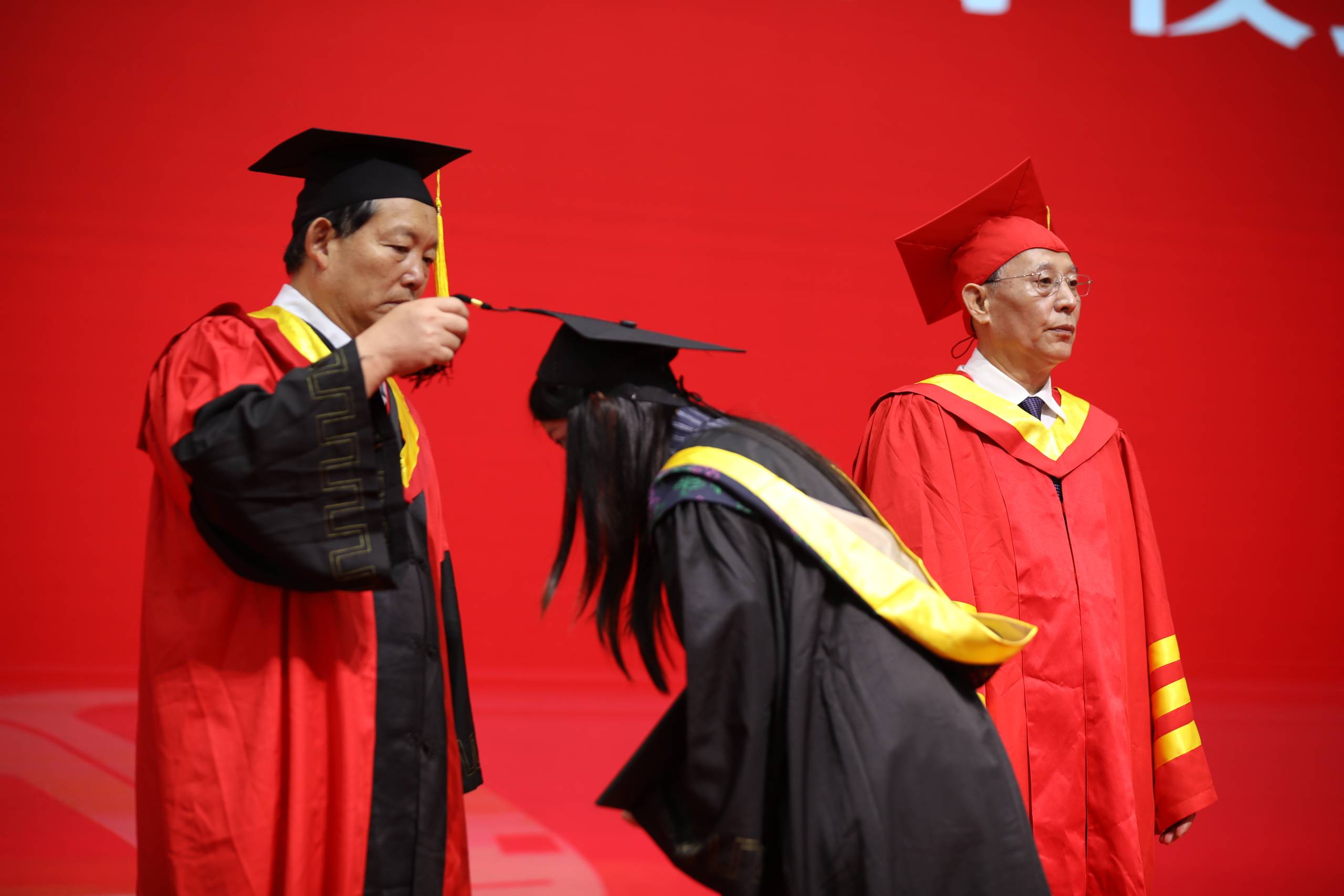 学位授予仪式由校长助理、教务处处长潘春辉主持,在各二级学院院长的邀请下,校学位评定委员会名誉主席、理事长张晋生教授,校学位评定委员会主席、校长刘建朝教授为2023届毕业生一一拨流苏并颁发学位证书。