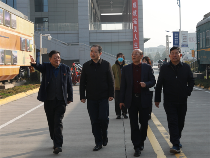 陕西省学生就业与留学服务中心主任相勇(左二)、学校理事长张晋生(左三)、 校长刘建朝(左四)、党委书记马智勇(左一)参观铁路文化教育馆