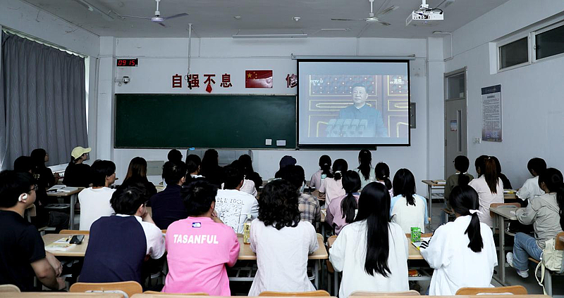 当激昂的国歌响起,全体师生自发起立,齐声高唱国歌,声音响彻校园的每一个角落。在阅兵式过程中,受阅部队整齐划一的步伐、威武雄壮的军姿、先进精良的装备,让师生们目不暇接,赞叹不已。从教学楼的阶梯教室到校务楼会议室,从文体中心到餐厅的公共观影区,原本的喧嚣被庄重取代,每一个专注的身影,都让校园变成了一堂生动而厚重的爱国主义实景课。