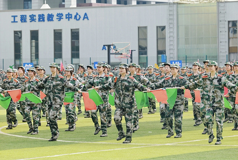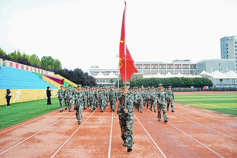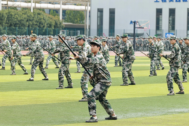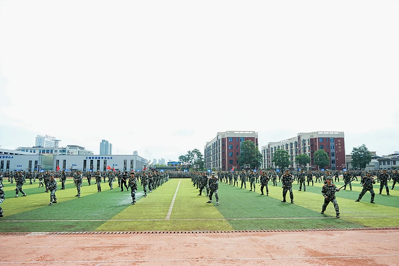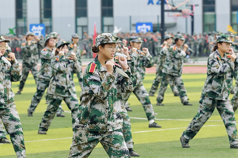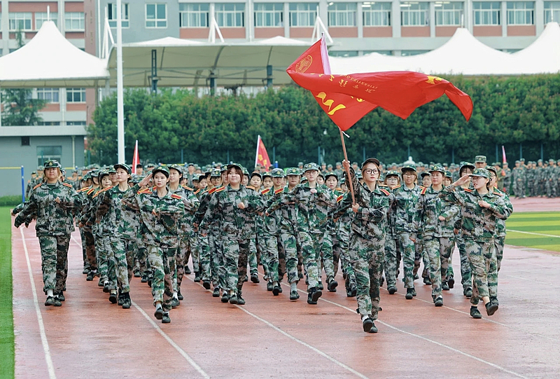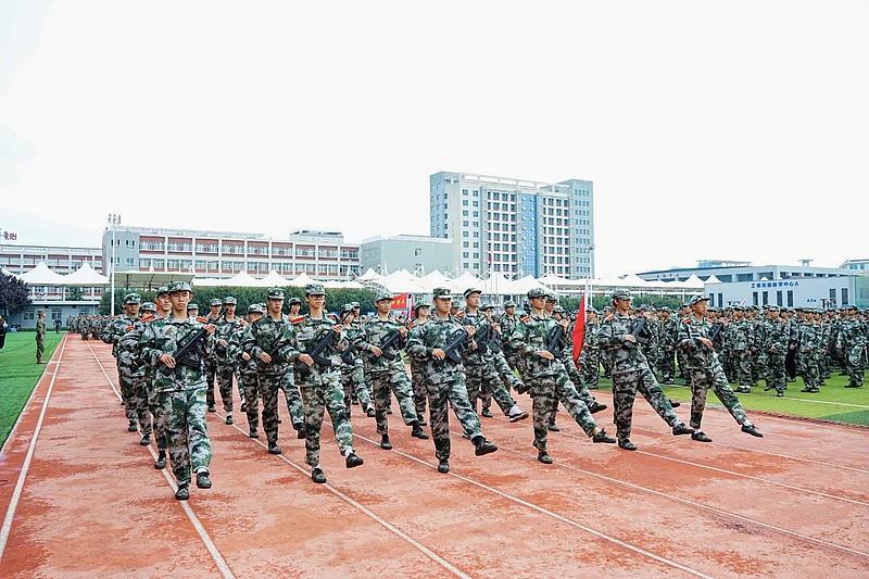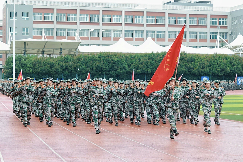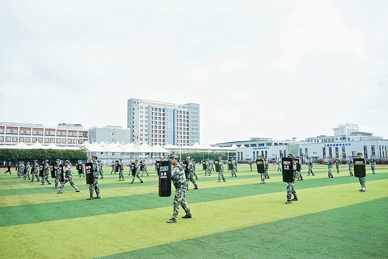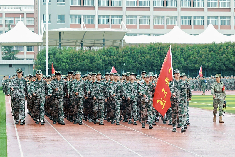 上午九时许,庄严的国歌声中,典礼正式拉开帷幕。同学们目光坚定、步伐铿锵、口号响亮,以饱满的精神和整齐的队列依次经过主席台,接受检阅。分列式上,军体拳方队、棍术方队、花样方队、女子匕首操方队等训练项目用高昂的斗志和振奋人心的口号,全面展示了十四天军训的丰硕成果,彰显出2025级新生昂扬的精神面貌和顽强的意志品质。