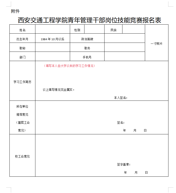 2.请各单位积极组织青年管理干部报名参赛,并对参赛教师予以必要的支持;各基层工会作为本次竞赛的协助单位,须在10月29日之前发送报名表电子邮件至指定邮箱。