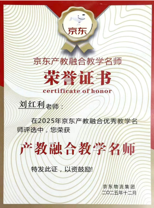在育人实践中,学校高度重视师资队伍建设,着力培育兼具教学能力与产业视野的“双师型”教师团队。人文与管理学院教师刘红利深耕产教融合教学一线,始终坚持“教学过程与产业需求对接、课程内容与职业标准契合”,将京东供应链运营案例与教学创新深度结合,开发项目化教学模块,带领学生在真实产业场景中锤炼专业技能,其教学成果与育人成效获得研讨会组委会与京东集团的高度赞誉,成功入选优秀教学名师。