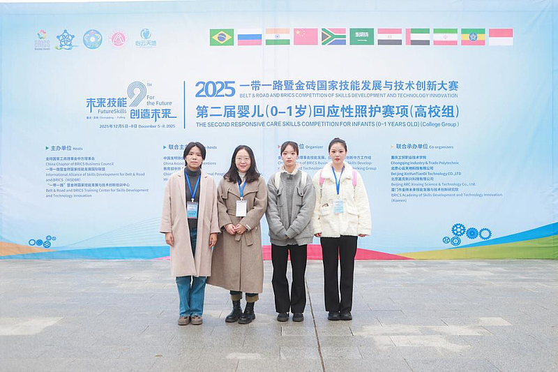 12月5日至8日,2025一带一路暨金砖国家技能发展与技术创新大赛第二届婴儿(0-1岁)回应性照护赛项(高校组)全国总决赛在重庆工贸职业技术学院成功举办。在必赢陈福珍、时晨露两位老师的专业指导下,学前教育专业学生田迎秋、李景雯经过层层选拔与激烈角逐,最终分获全国总决赛高校组二等奖与优秀奖。