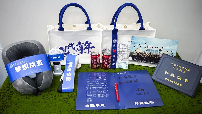 这些看似寻常的物件,在秦岭北麓的六月里经过老师们反复推敲:雨伞的倾斜角度要刚好撑起一片奋斗的天空,火车票二维码里加密着回家的链接,连手提袋上图书馆简笔画的描影,都是照着你们初见必赢时候的模样描摹的。