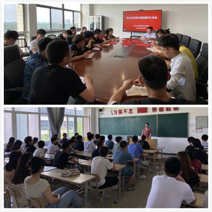 ——开展毕业生离校教育。在2021届毕业生离校之际,土木工程学院多形式开展毕业生离校教育。辅导员深入学生宿舍、图书馆等场所,及时了解毕业生思想动态;以班级为单位开展最后一次主题班会,将爱校荣校教育和文明离校教育相融合,引导毕业生树立自身良好形象,为在校生作出示范和榜样,发挥好“传帮带”作用;开展诚信感恩教育,做好助学贷款学生的诚信教育工作,帮助毕业生牢固树立诚实守信意识,强化学生爱校尊师意识;学生党支部召开毕业生党员专题组织生活会,进一步强化毕业生党员理想信念、责任意识和担当精神,牢固树立党员意识。