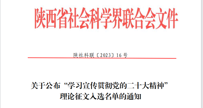 2月16日,陕西省社会科学界联合会发布了《关于公布“学习宣传贯彻党的二十大精神”理论征文入选名单的通知》陕社科联〔2023〕16 号。人文与管理学院赵鲲鹏、谢恬、陈星宇、何建武的文章《用社会主义核心价值观 镌刻民族文化精神丰碑》和张萍、彭涛的文章《弘扬五种精神 勇担育人使命》入选。