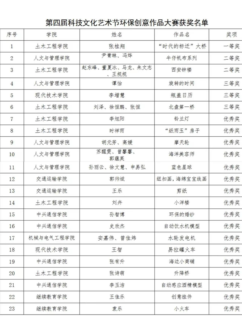 本次“垃圾,其实是放错位置的资源”环保创意大赛作为第四届科技文化艺术节系列活动的组成部分,旨在强化学生科技创新精神和实践能力,以新视觉引导学生关注环保节约,主动学习环保知识,积极参加环保实践,为学生激发内在创意创新活力搭建了一个锻炼的平台。