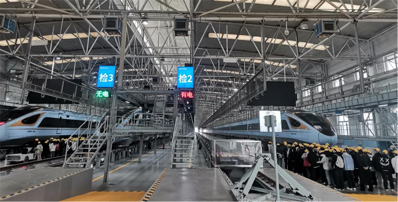 研学第二站到达动车组郑西库,该段动车静调库南侧即是西汉时期的渭河上厨城门桥遗址,2000多年前,张骞出使西域时,曾踏上过古渭桥遗址厨城门一号桥,而后一路西行。在静调库中,动车检修工程师带领同学们实地观摩动车,为大家讲解动车结构知识,同学们近距离接触到了正在对动车组列车进行精细整备和检修的“动车医生”们,深刻体会到了动车检修工作的严谨性、复杂性,清晰地感受到“工匠精神”指引着每一位普通的劳动者在平凡的工作中发光发热。