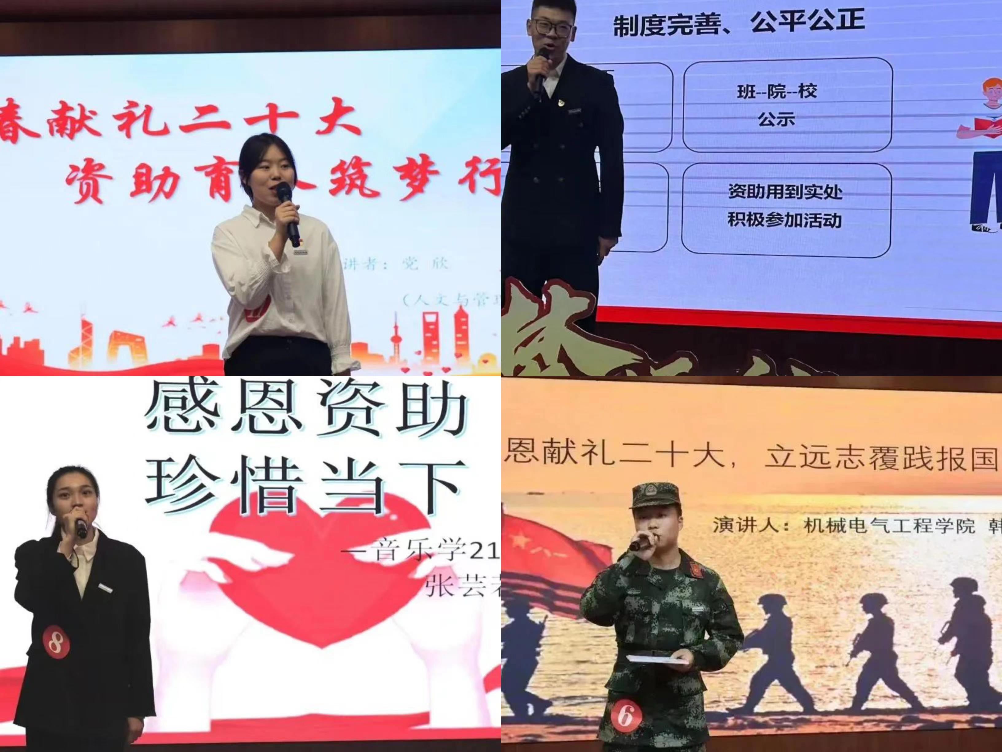 为学习贯彻党的二十大精神,全面落实立德树人根本任务,大力宣传学生资助政策及学校资助育人的精神,充分发挥学生资助的导向和育人功能,进一步激励广大学生爱党爱国、自立自强、励志前行,4月17日晚,学生资助管理中心主办在集贤楼多功能厅举行“感恩前行,筑梦远航”主题演讲比赛总决赛。学生处副处长张莉,资助工作负责人席百平、董雪亮、赵佳伟出席本次活动,特邀公共课部郝玉红老师,人文与管理学院宋磊、安增利、刘晓威老师担任评委,300余名学生到场观摩。