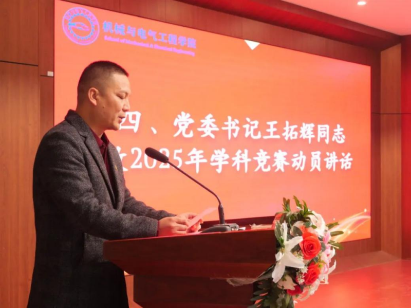 会上,丁旺才宣读了《2024年度学科竞赛暨大学生创新实践表彰文件》。对在第十八届全国大学生智能汽车竞赛、第九届全国应用型人才综合技能竞赛、全国首届新能源制氢储氢及发电技术竞赛等国家级赛事中获奖的学生团队、优秀学生、优秀指导教师给予了高度认可并颁发荣誉;吴伟副校长、石广田副校长等与会领导依次为获奖学生和优秀指导教师进行了颁奖。机械与电气工程学院党委书记王拓辉做了2025年大学生学科竞赛暨创新实践活动做了动员,希望广大师生能够继续发扬拼搏进取的精神,积极参与各类竞赛和实践活动,共同携手开创学院发展的新篇章。颁奖结束后,获奖学生代表赵振江同学进行了分享发言。他结合自己的参赛经历和成长中的心得体会,鼓励在场同学珍惜参与竞赛的宝贵机会,勇于挑战自我,在实践中持续精进创新能力与实践技能。