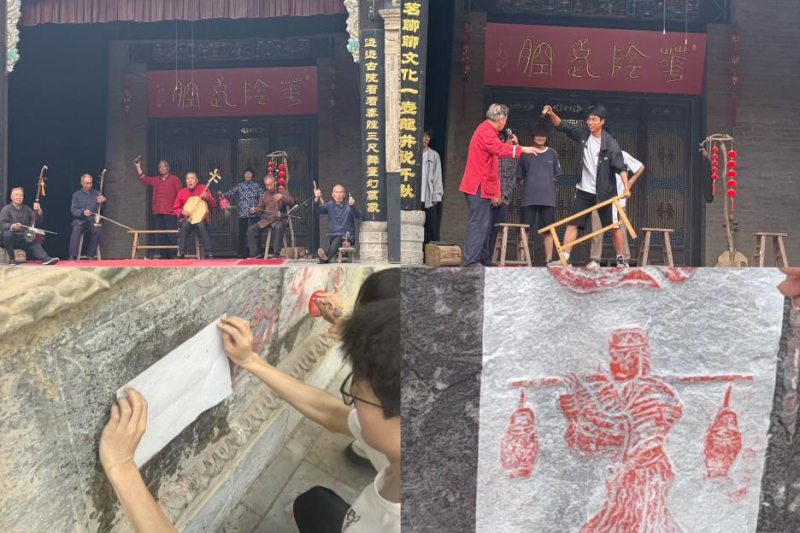 第三站——关中民俗博物院,开启传统文化深度研学之旅。古色古香的明清建筑群落、精妙绝伦的砖雕木雕、丰富多样的民俗展品,全方位展现了关中地区深厚的历史文化底蕴。在博物院中,学生们不仅驻足观赏各类文物,更深度参与到文化体验活动中——在艺人和老师的指导下,他们亲手尝试古建筑图案拓片制作,感受传统技艺中“以纸传史”的独特魅力;现场沉浸式体验华阴老腔表演时,铿锵激昂的唱腔、刚直高亢的曲调,搭配艺人震撼人心的表演,瞬间点燃了现场气氛。学生们或跟随节奏鼓掌,或尝试学习唱腔。从传统农耕文化到民间手工艺,从礼仪习俗到戏曲表演,通过实地观摩与互动体验,学生们深刻理解艺术背后的文化根基。