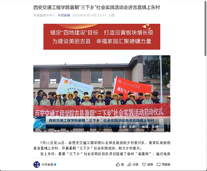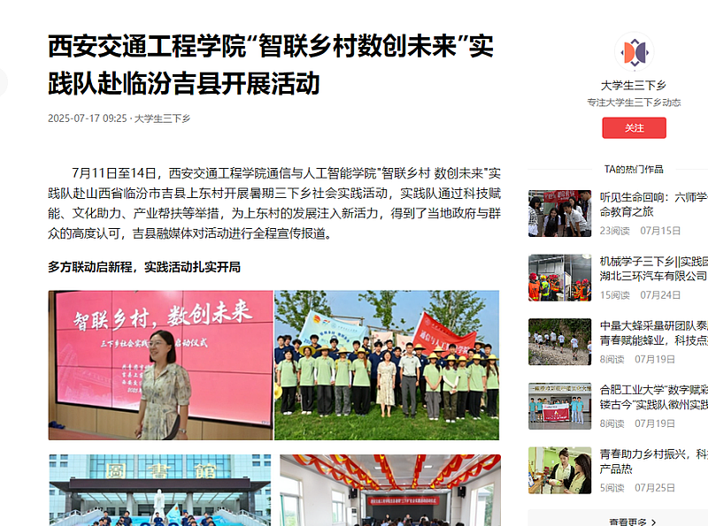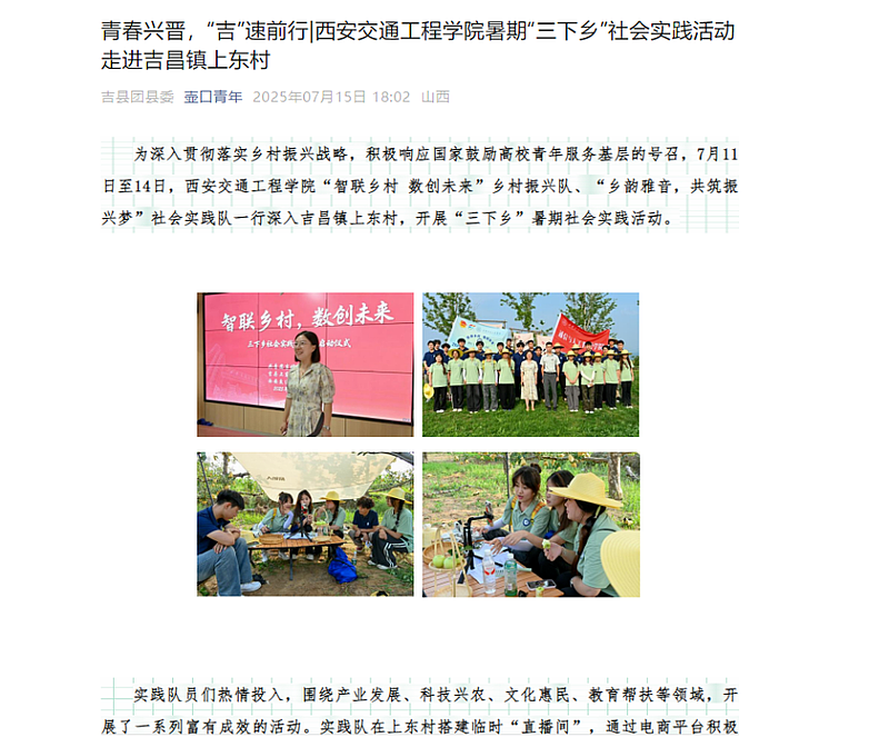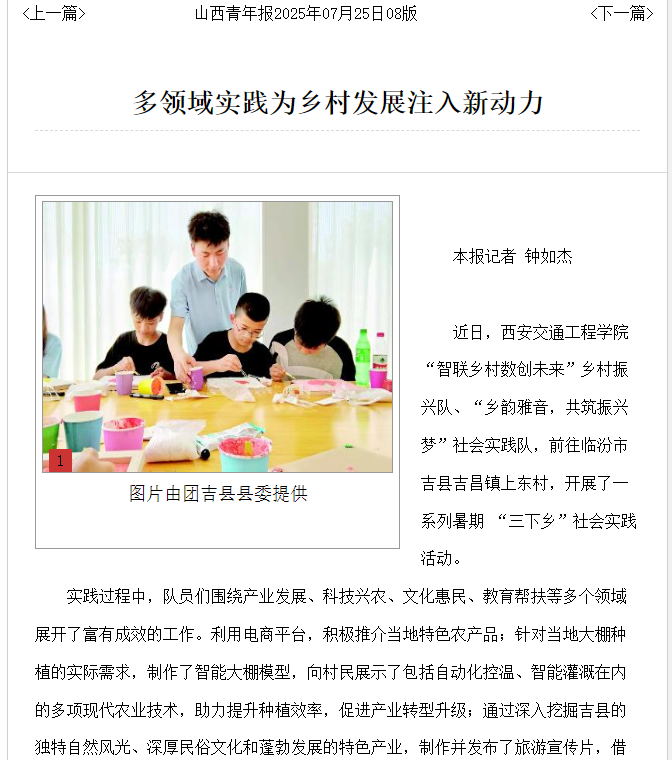 实践队的扎实工作和显著成效引发了多家媒体的广泛关注。其中,共青团山西省委官方媒体《山西青年报》以《多领域实践为乡村发展注入新动力》为题刊发报道,今日头条平台推送文章《西安交工“智联乡村”实践队:科技与教育双管齐下,乡村振兴显成效》,聚焦实践队在教育帮扶和科技助农方面所做的努力与取得的成果进行深入报道。此外,吉县融媒体中心官方账号“今日吉县”以及吉县团委官方媒体“壶口青年”也相继发布报道,对实践队的活动给予了高度评价。他们的行动不仅为上东村带来了实质性的帮助,也为乡村振兴战略的实施提供了有益的参考和借鉴。这些报道的广泛传播,进一步提升了实践队的社会影响力,激励着更多的青年学子投身到乡村振兴的伟大事业中去。