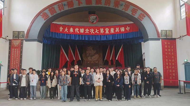 在杨家岭革命旧址,同学们在讲解员带领下认真参观了所有历史遗迹。在中共七大会址——中央大礼堂内,红色木椅排列整齐,主席台上方“在毛泽东的旗帜下胜利前进”的标语依然醒目。通过实物陈列与历史影像,学生们系统了解了中共七大确立毛泽东思想为党的指导思想的重要历程,深刻认识到马克思主义中国化的第一次历史性飞跃对中国革命的关键意义。