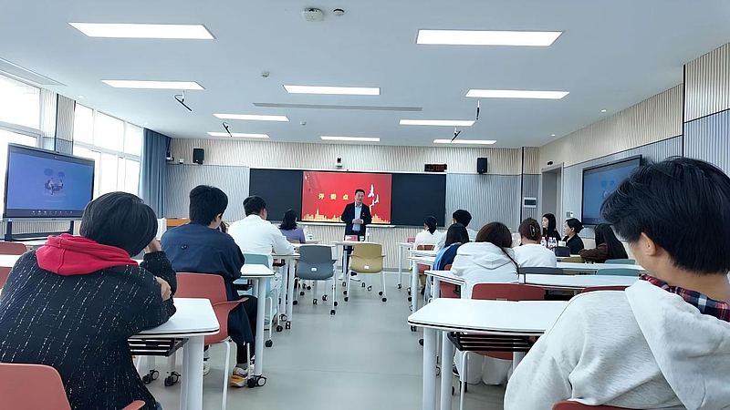 大赛颁奖典礼在智慧教室举行。学院领导、评委代表、获奖学生代表等出席了典礼。典礼上获奖学生代表分享了创作心得,学院领导对大赛意义和成果给予了高度评价,鼓励教师要用青年喜爱的形式让思想政治理论课‘活起来’,引导学生在创作中深化理论认知,在实践中坚定理想信念。这些作品既是思想政治课教学改革的成果缩影,更是青年学子将‘小我’融入‘大我’的生动宣言,并鼓励同学们继续深入学习马克思主义理论,争做担当民族复兴大任的时代新人。