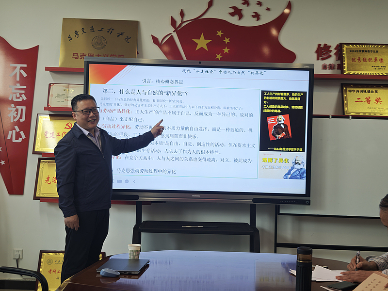 为加强高校思政教师作为思想引领“大先生”的使命担当,推动人与自然和谐共生的现代化,引导青年大学生树立“尊重自然、顺应自然、保护自然”的发展观,9月24日,马克思主义学院邀请长安大学教授孙百亮作题为《现代“加速社会”中的人与自然“新异化”》的主题讲座。讲座由马克思主义学院院长段联合主持,学院全体教师聆听了讲座。