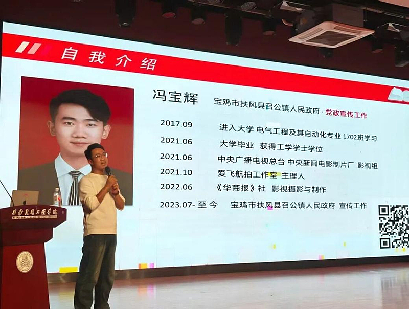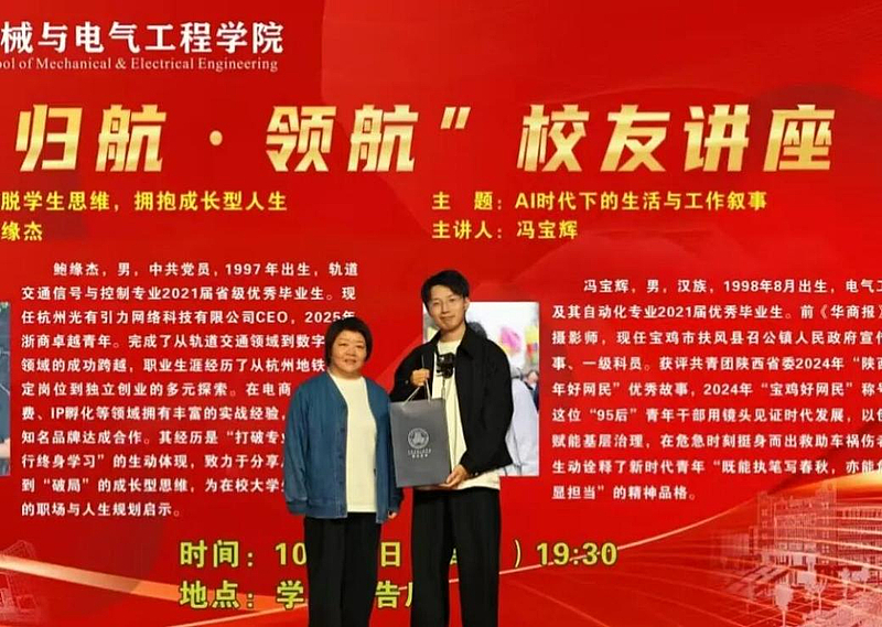 活动伊始,王拓辉向在场师生介绍了两位校友的成长历程与奋斗故事。鲍缘杰,机械与电气工程学院轨道交通信号与控制专业2021届省级优秀毕业生,现任杭州光有引力网络科技有限公司CEO,荣获“2025年浙商卓越青年”称号;冯宝辉,电气工程及其自动化专业2021届优秀毕业生,曾任《华商报》社摄影师,现为宝鸡市扶风县召公镇人民政府宣传干事,荣获“2024年陕西青年好网民”“宝鸡好网民”称号。校友工作办公室主任王华代表学校向两位校友赠送纪念礼物,表达母校的深切祝福与殷切期望。