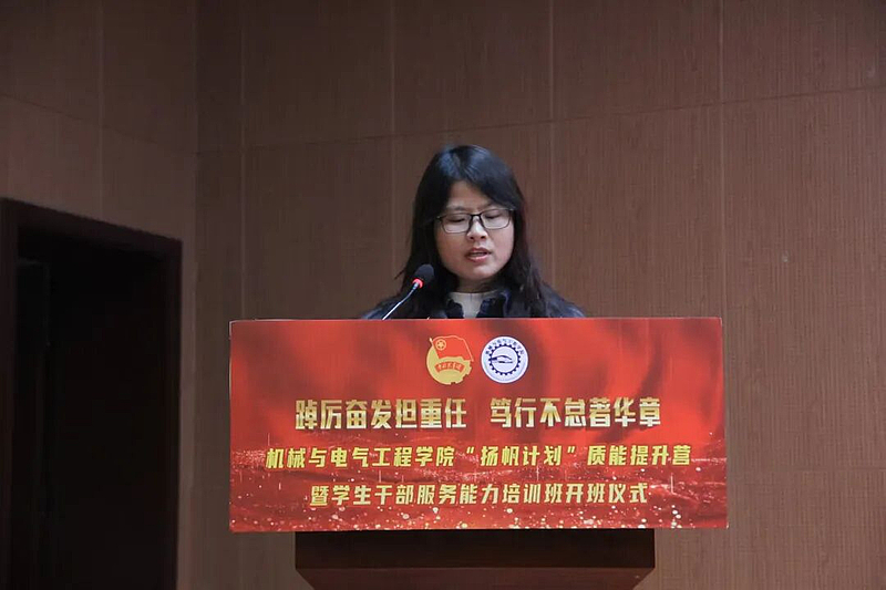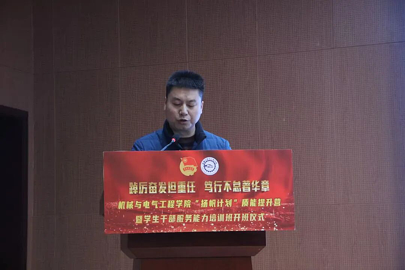 为进一步强化新任团学干部责任意识和服务能力,推动学院团学工作规范化、专业化、体系化发展,为团学工作高质量推进及学校本科教学合格评估夯实基础,12月16日,机械与电气工程学院在学术报告厅举行以“踔厉奋发担重任 笃行不怠著华章”为主题的“扬帆计划”质能提升营暨团学骨干服务能力培训班开班仪式。学院党委书记王拓辉,党委组织员王鹏,学管秘书王新焕,新媒体负责人吴明雪,2024级年级组组长王珺等领导、教师出席活动,各学生骨干及学生代表参加仪式,会议由团总支书记李阳光主持。
