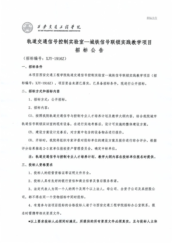 565.net必赢客户端轨道交通信号控制实验室—城铁信号联锁实践教学项目招标公告