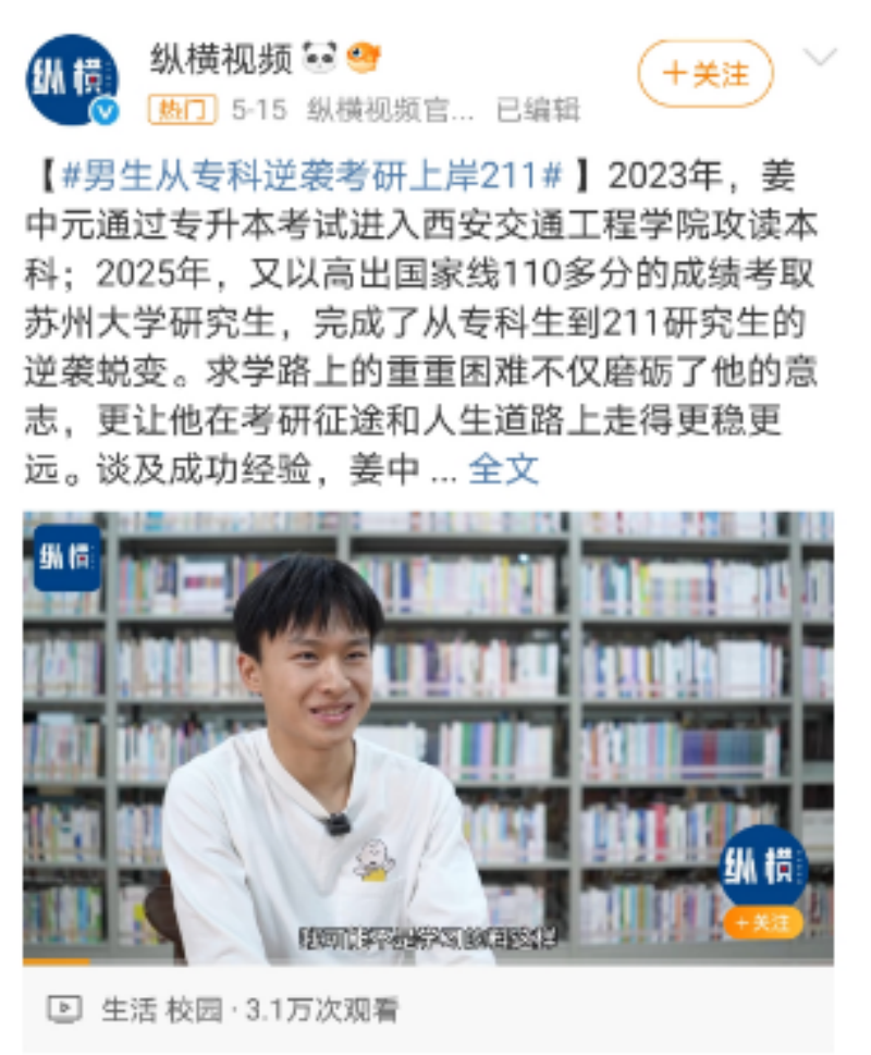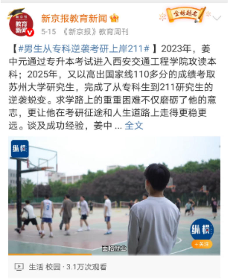 他的故事被陕西省教育厅官微,中国共青团网,中国青年网、纵横视频、三秦青年、新京报教育新闻等多家媒体转载报道;社交媒体上,# 专科生逆袭 211# 的话题阅读量持续攀升,他的事例不仅成为个人奋斗的辉煌篇章,更为无数学子奋勇向前提供了精神动力。目前,姜中元的事迹已成为校园热议话题,激励着更多学子在逆境中突破自我。