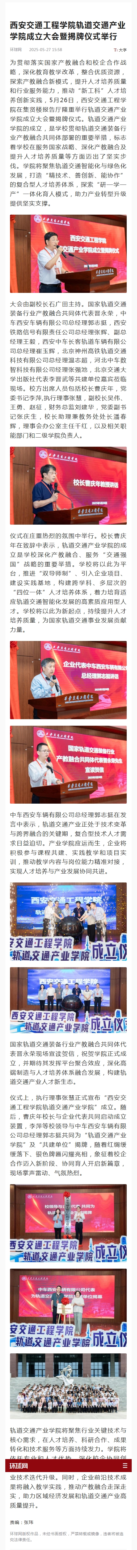 轨道交通产业学院将聚焦行业关键技术与核心需求,在人才培养、科研合作、成果转化和技术服务等方面持续发力。学院将依托专业和人才优势,深化校企协同创新,推动科研成果高效转化落地,支持企业技术迭代升级。同时,企业前沿技术成果将融入教学实践,推动产教融合走深走实,助力区域经济发展和轨道交通产业高质量提升。