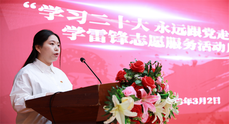 仪式在志愿者们声情并茂的诗朗诵《怀念雷锋》中拉开帷幕。团委书记千红同志就本次“学习二十大 永远跟党走 青春志愿行”学雷锋活动月作了总体安排部署,她表示要以习近平新时代中国特色社会主义思想为指导,紧紧围绕党的二十大关于完善志愿服务制度和工作体系的要求,持续组织必赢青年志愿者积极参与助老助残、生态环保等志愿服务八大行动,并就十项子活动作了具体安排及要求。千书记指出,各团总支要积极搭建服务平台,精心设计活动载体,完善志愿服务机制,统筹协调力度,常态化开展各项志愿服务活动,要巩固队伍、建立阵地、推出品牌、选树典型、表彰模范、联络媒体,形成集项目、队伍、机制、阵地、宣传于一体的志愿服务常态化运行模式。各级志愿者服务队要利用宣传矩阵,广泛宣传学雷锋志愿服务活动开展情况,深入挖掘学雷锋志愿服务中的典型事迹,大力宣传特色志愿服务活动,展现西必赢青年志愿者风采,形成示范导向,营造良好校园文明风尚。团结带领全校学生进一步传承和弘扬雷锋精神,为学校顺利通过本科教学合格评估工作贡献青春智慧和力量。