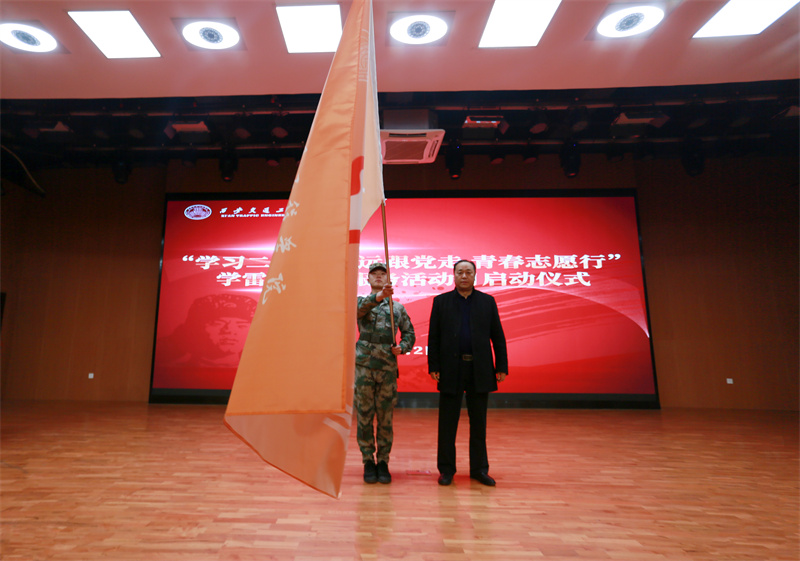 副校长王勇同志、党委宣传部部长界威锋同志先后为校院两级志愿服务队授旗。