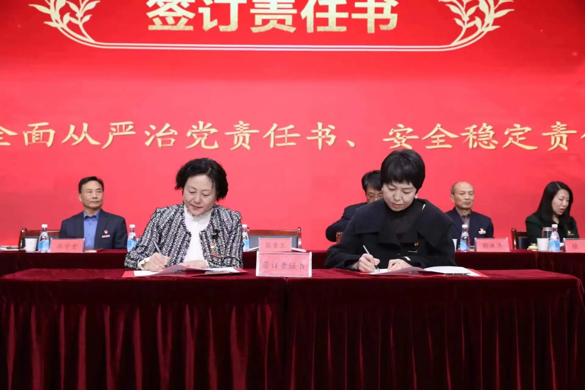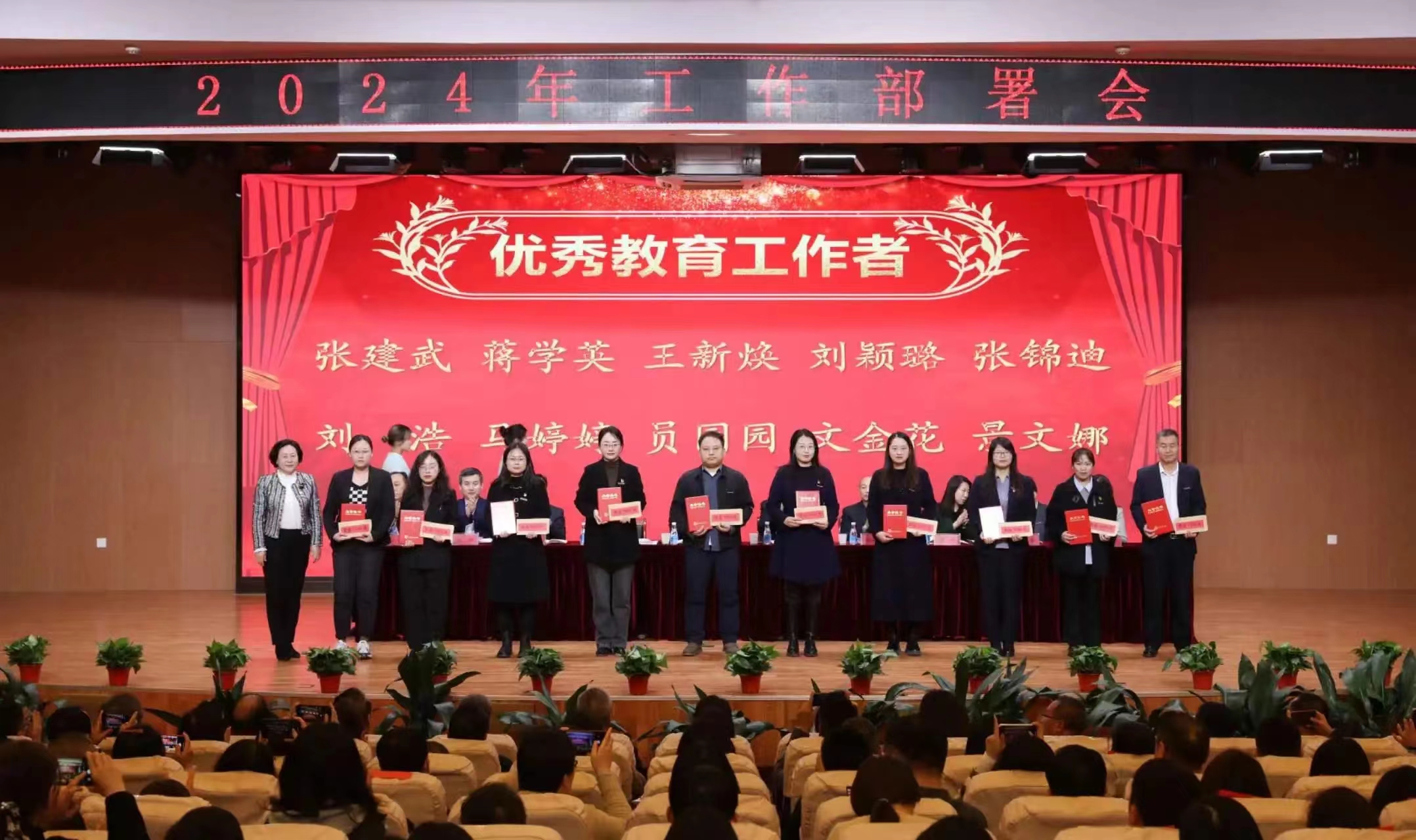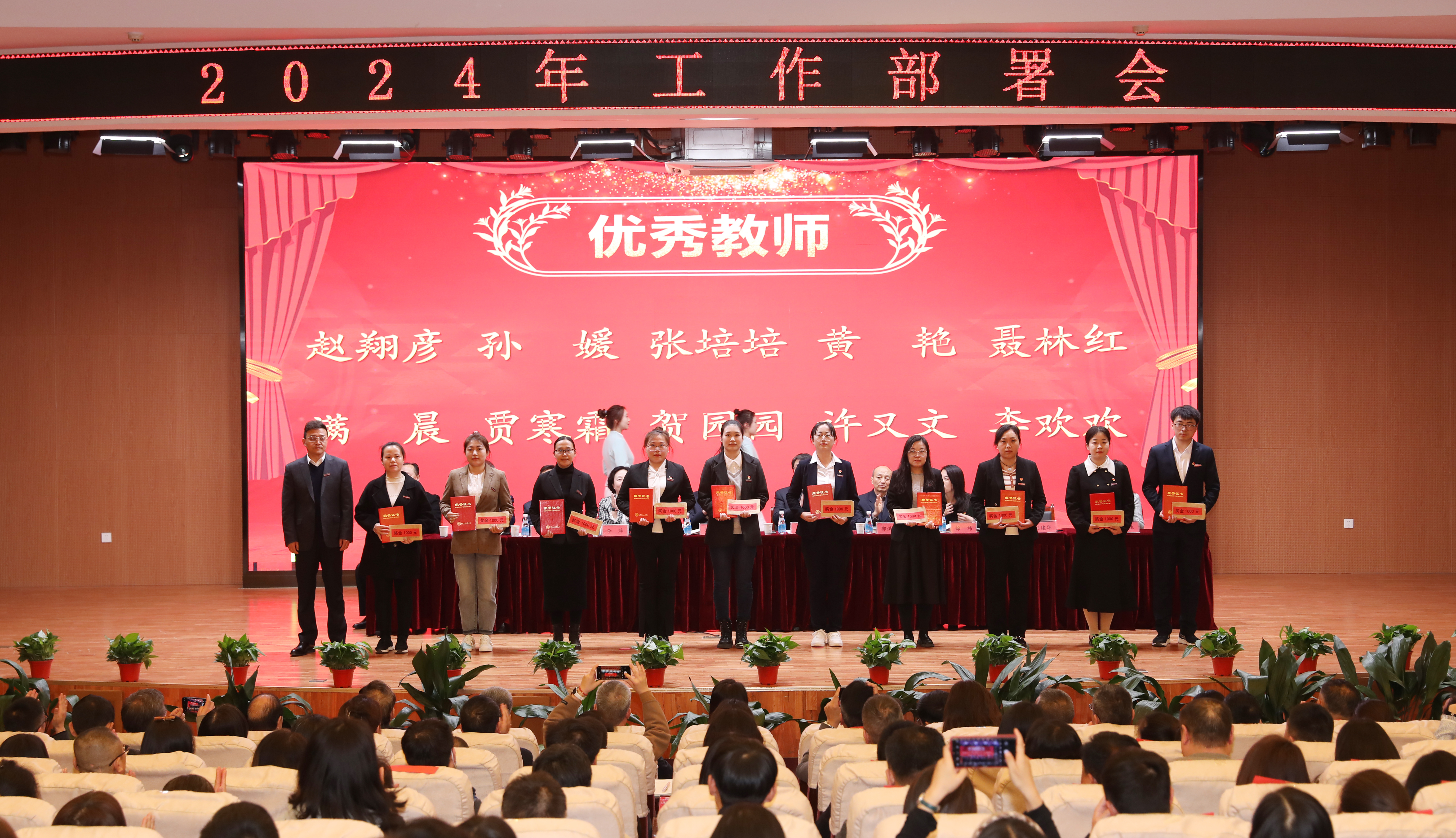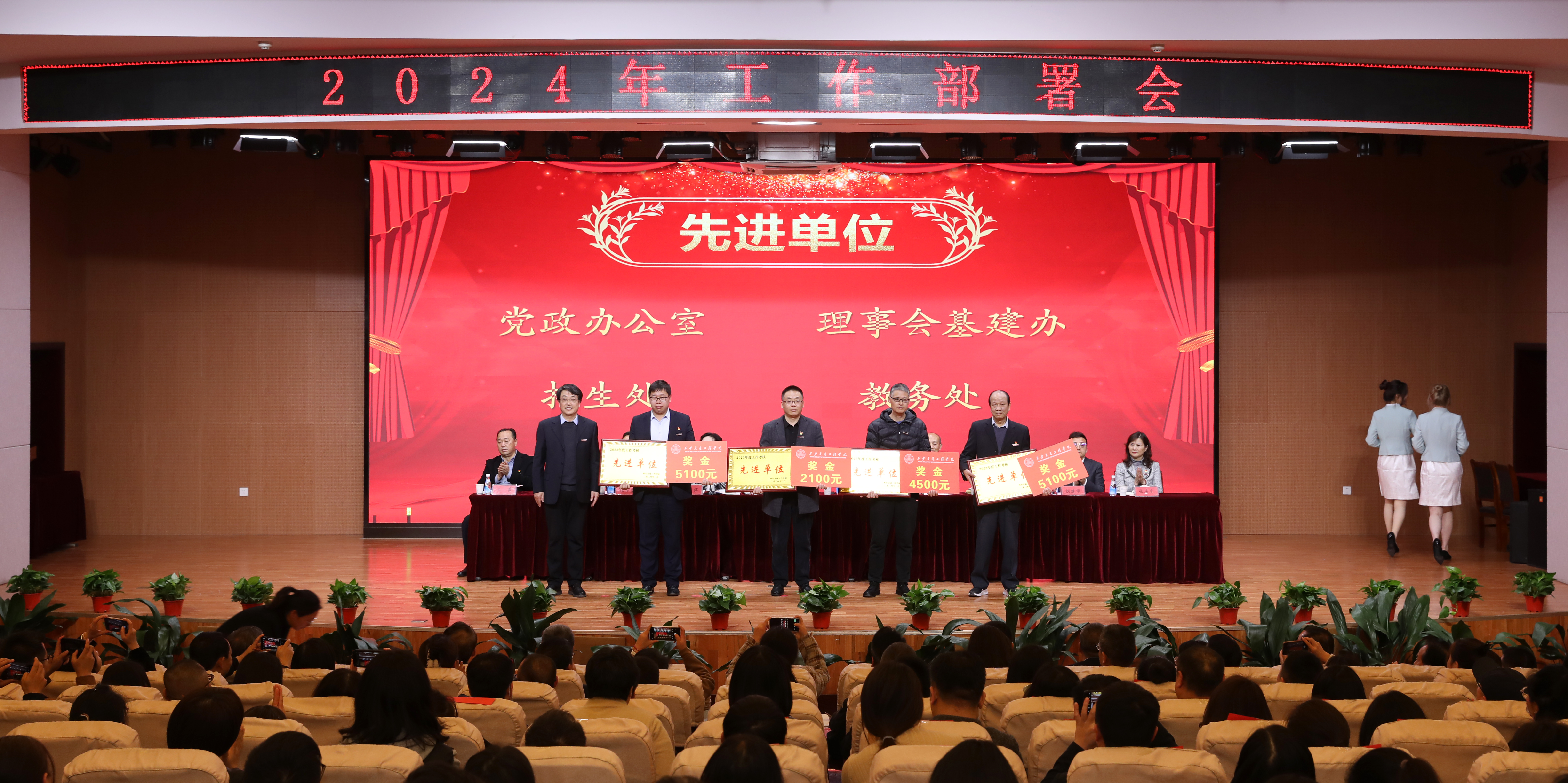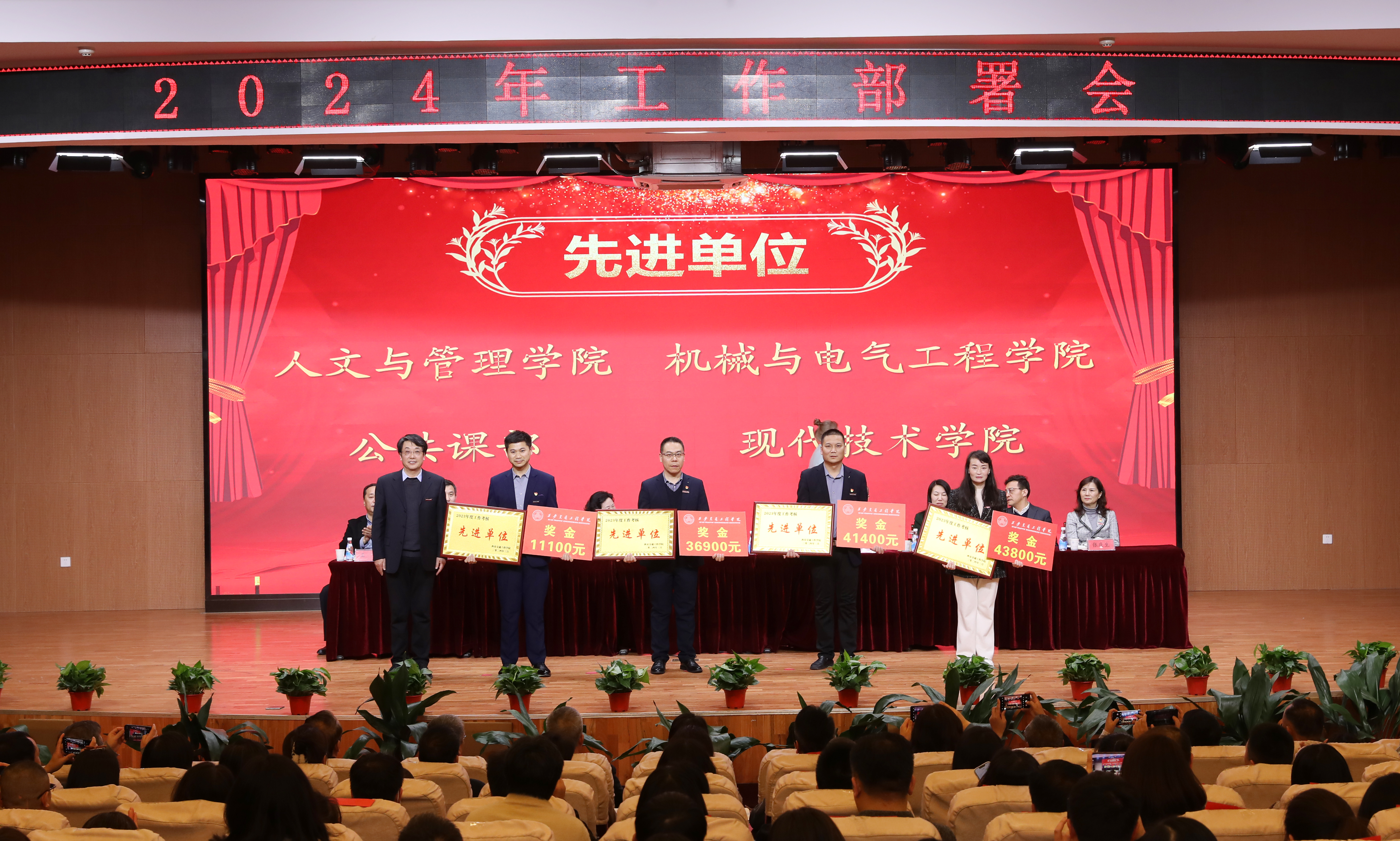 第二阶段会议由李萍书记主持,曹庆年校长宣读了《关于表彰2023年度先进单位 、优秀教师、优秀教育工作者、优秀处级干部的决定》,与会领导为获奖单位和个人颁奖;李萍书记分别与现代技术学院党委、公共课部党总支、机关党委签订了全面从严治党责任书;张晋生理事长分别与学生处、保卫处、人文与管理学院签订了安全稳定责任书。