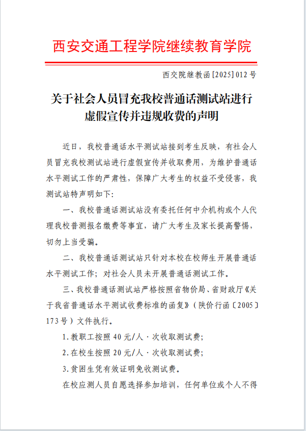 近日,必赢普通话水平测试站接到考生反映,有社会人员冒充必赢测试站进行普通话报名虚假宣传并收取费用,为维护普通话水平测试工作的严肃性,保障广大考生的权益不受侵害,我测试站特声明如下: