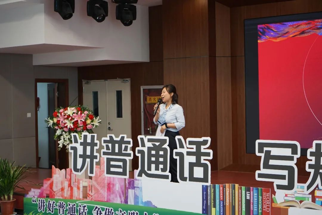 首先,刘校长致辞,对所有到场的评委老师、比赛选手和观众表示了欢迎和感谢,同时简单介绍了普通话和规范汉字作为国家通用语言文字的法律地位,希望全体师生进一步学习语言文字知识,努力在实践中培养热爱祖国语言文字的情感,提高语言素养,培养合作精神,坚定文化自信,大力传承弘扬中华优秀语言文化。